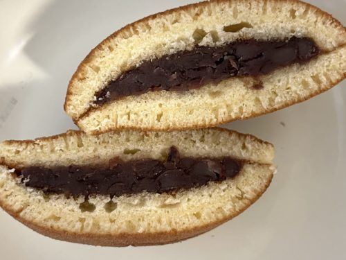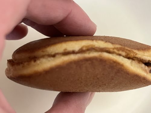 今まで僕が食べてきたどら焼きの中では小さいサイズ感ですが、厚みがあります。