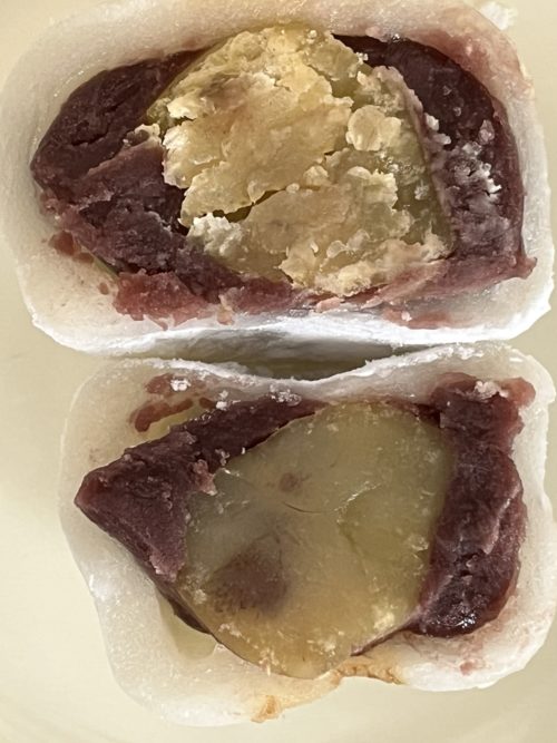 大きな栗が丸ごと一粒入っていて、周りのこしあんや餅皮全体が栗を引き立たせている印象でした!