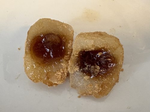 半分に切ると、瑞々しい黒糖蜜が入っていました。